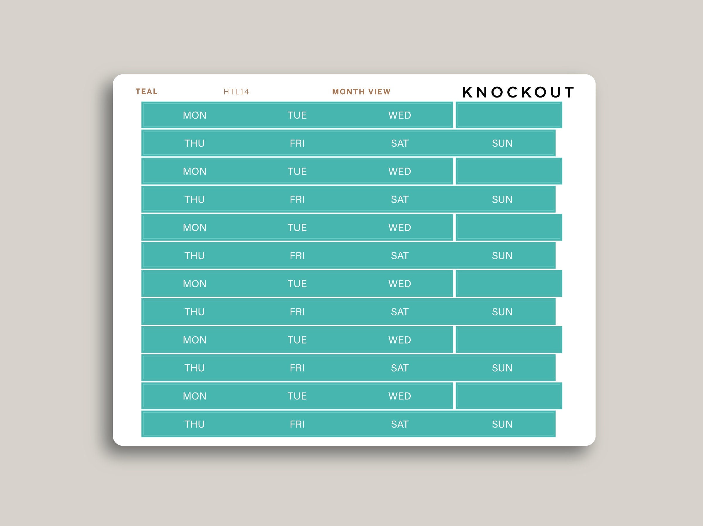 If you are looking to Change the day the Month View starts or add a pop of color to your Hobonichi Cousin Monthly spreads our Solid Month View Day of the Week Cover do the trick. These stickers are sized to cover Sunday start row of the Month View.