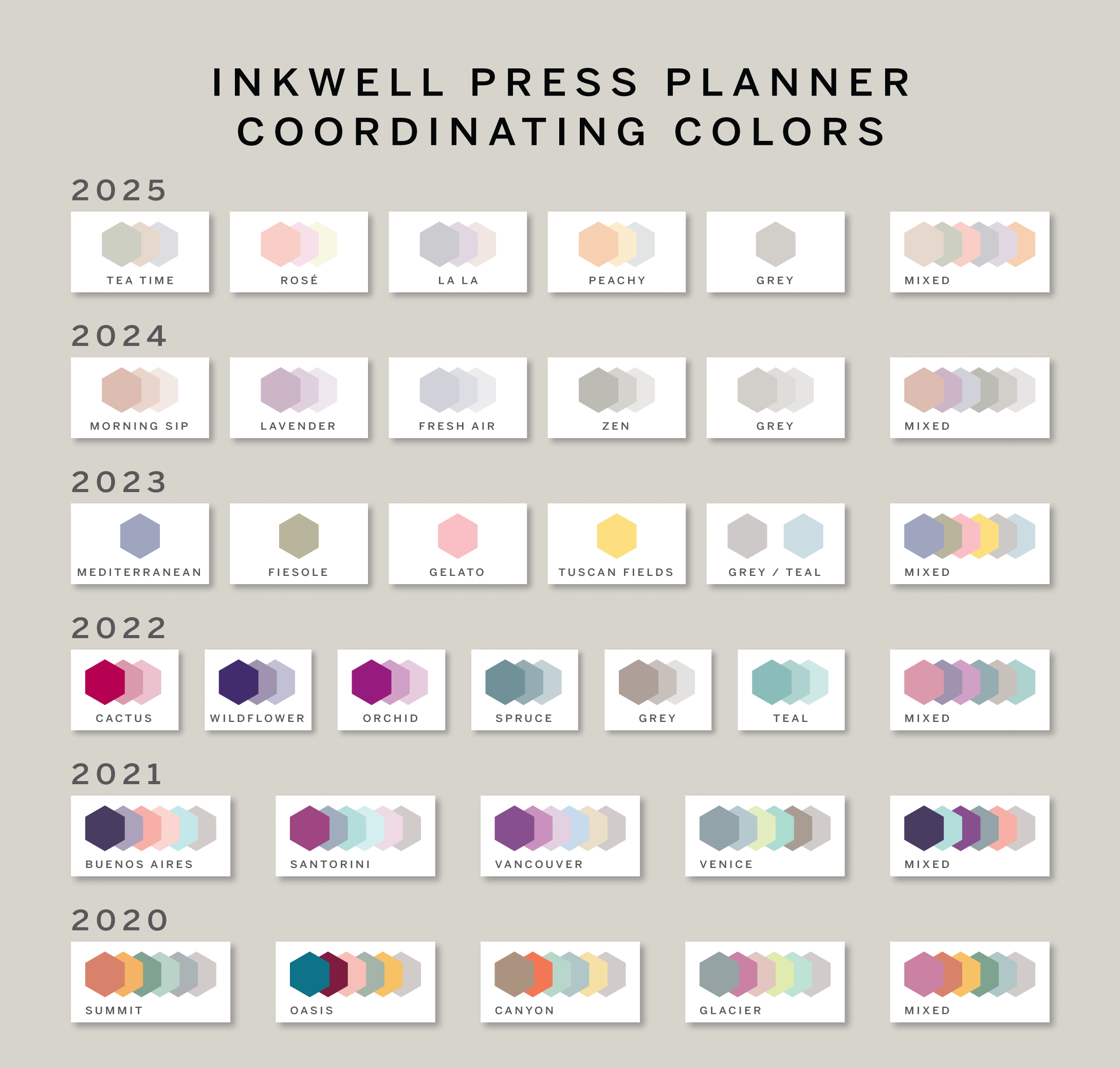 Colors: The color palettes are designed to beautifully coordinate with the 2025 Inkwell Press color schemes.